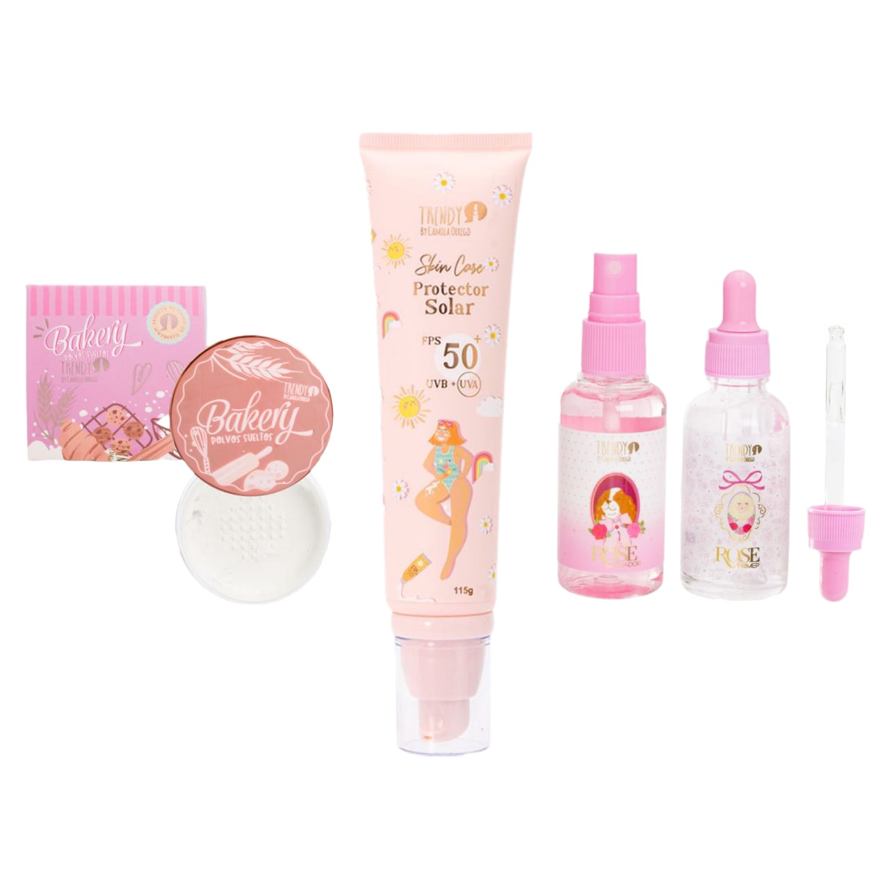 combo + Protector Solar Facial 115ML Trendy +Kit Primer Y Fijador Rose Facial + Polvo Suelto Bakery Pequeño